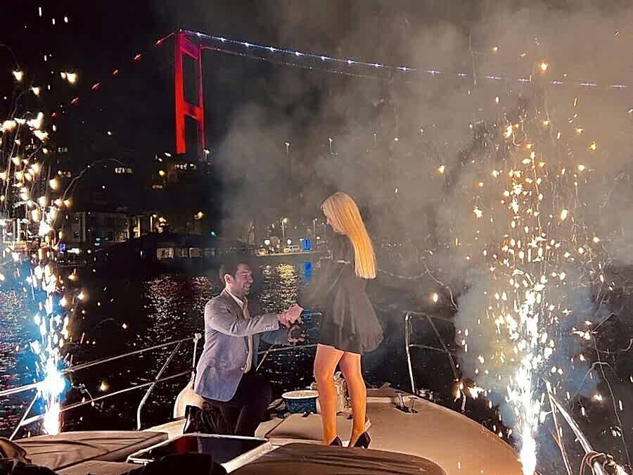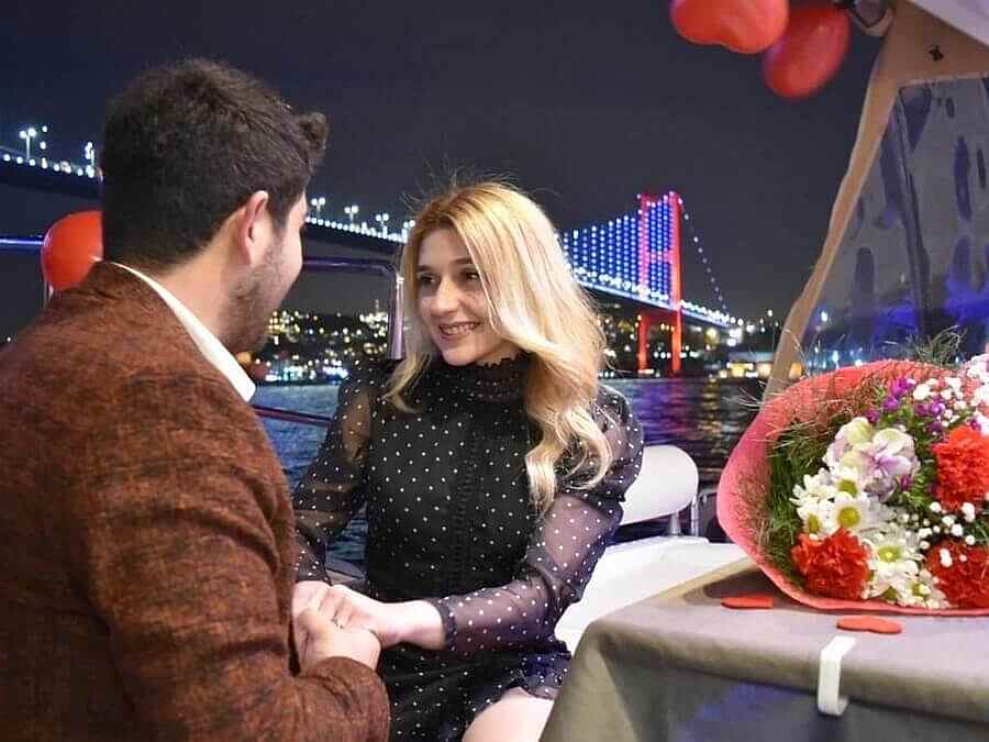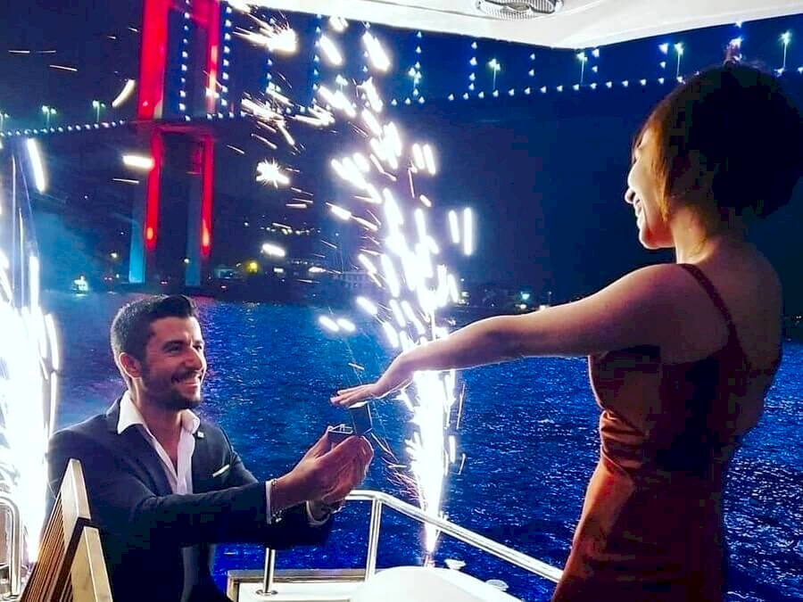 Yatta evlenme teklifi, İstanbul Boğazı’nda tamamen size ait özel bir yatla hayatınızın en önemli sorusunu unutulmaz bir atmosferde sormanın en etkileyici yoludur. Şehir silüeti ve Boğaz manzarası eşliğinde romantik ve sürprize uygun bir ortam hazırlanır. 2 kişilik yemekli, masa süslemeli ve kemancı eşliğinde yatta evlenme teklifi fiyatı 19.000 TL’den başlar.